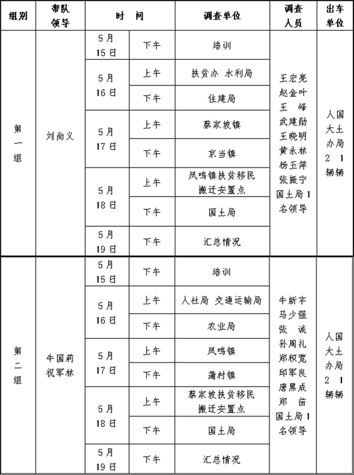 2、5月16日-18日每日上午8:00调查组人员在县委党校集中,统一前往视察调查;18日下午2 :30调查组全体人员在县国土局听取全县扶贫移民搬迁工作开展总体情况汇报;19日下午调查组全体人员在县委党校一楼东道德讲堂汇总情况。